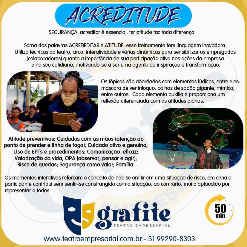 Por meio de intervenções rápidas no ambiente de trabalho ou apresentações com duração entre 30 e 50 minutos em diferentes eventos, promovemos treinamentos que estimulam a reflexão, fortalecem comportamentos positivos e incentivam a melhoria das atitudes no dia a dia.